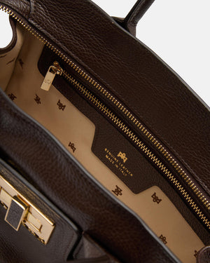 - Dettagli esterni: tasca frontale dotata di chiusura girevole con dettaglio in pelle e logo stampato a fuoco colore oro; tasca posteriore con chiusura con bottone magnetico.