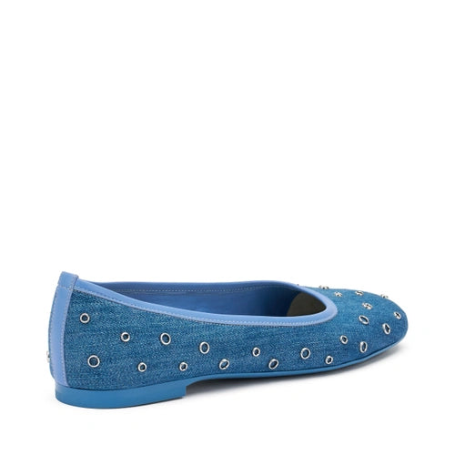 • Tomaia in denim profilata in pelle con borchiette a forma di occhiello applicate