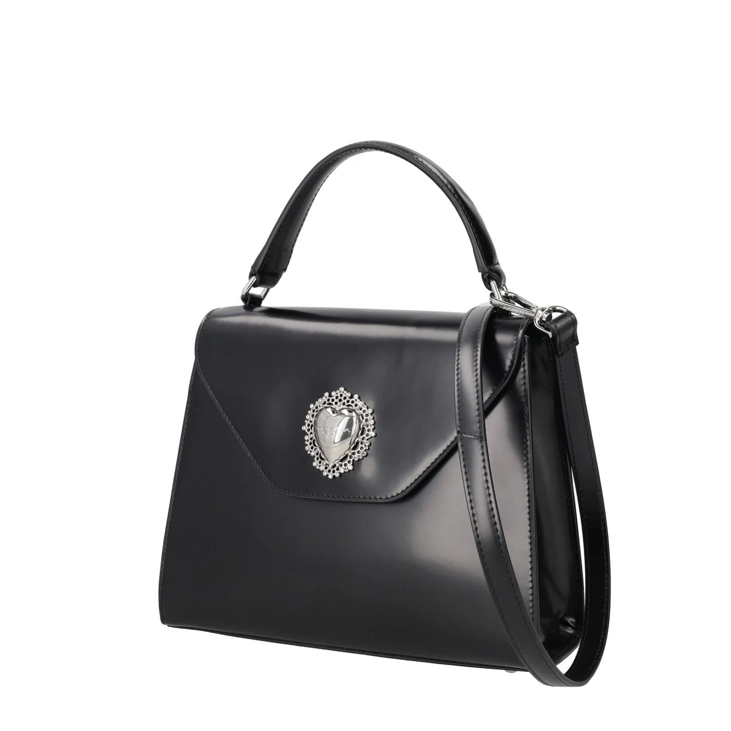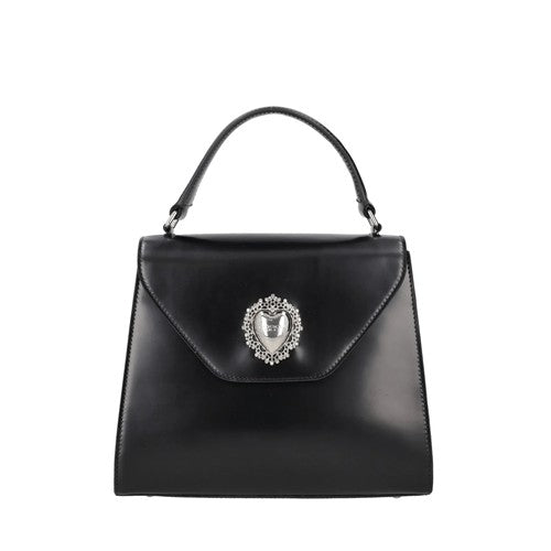 - Borsa con patta realizzata interamente in pelle di colore nero.