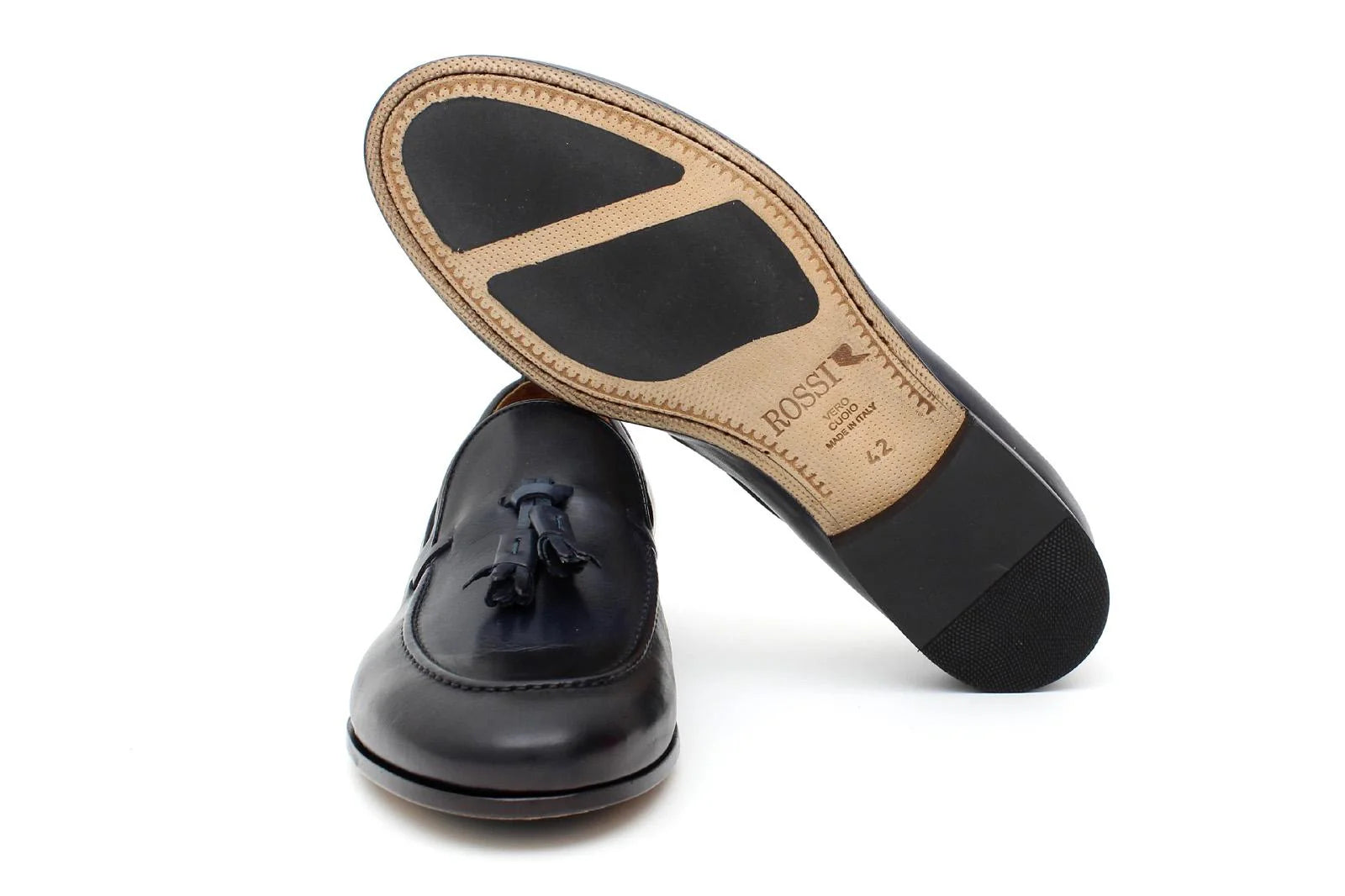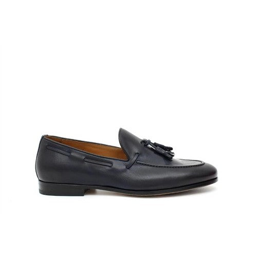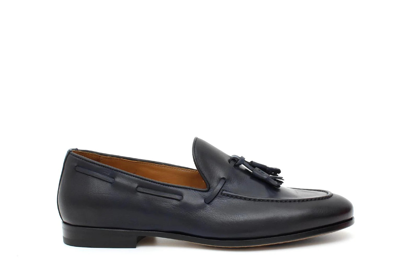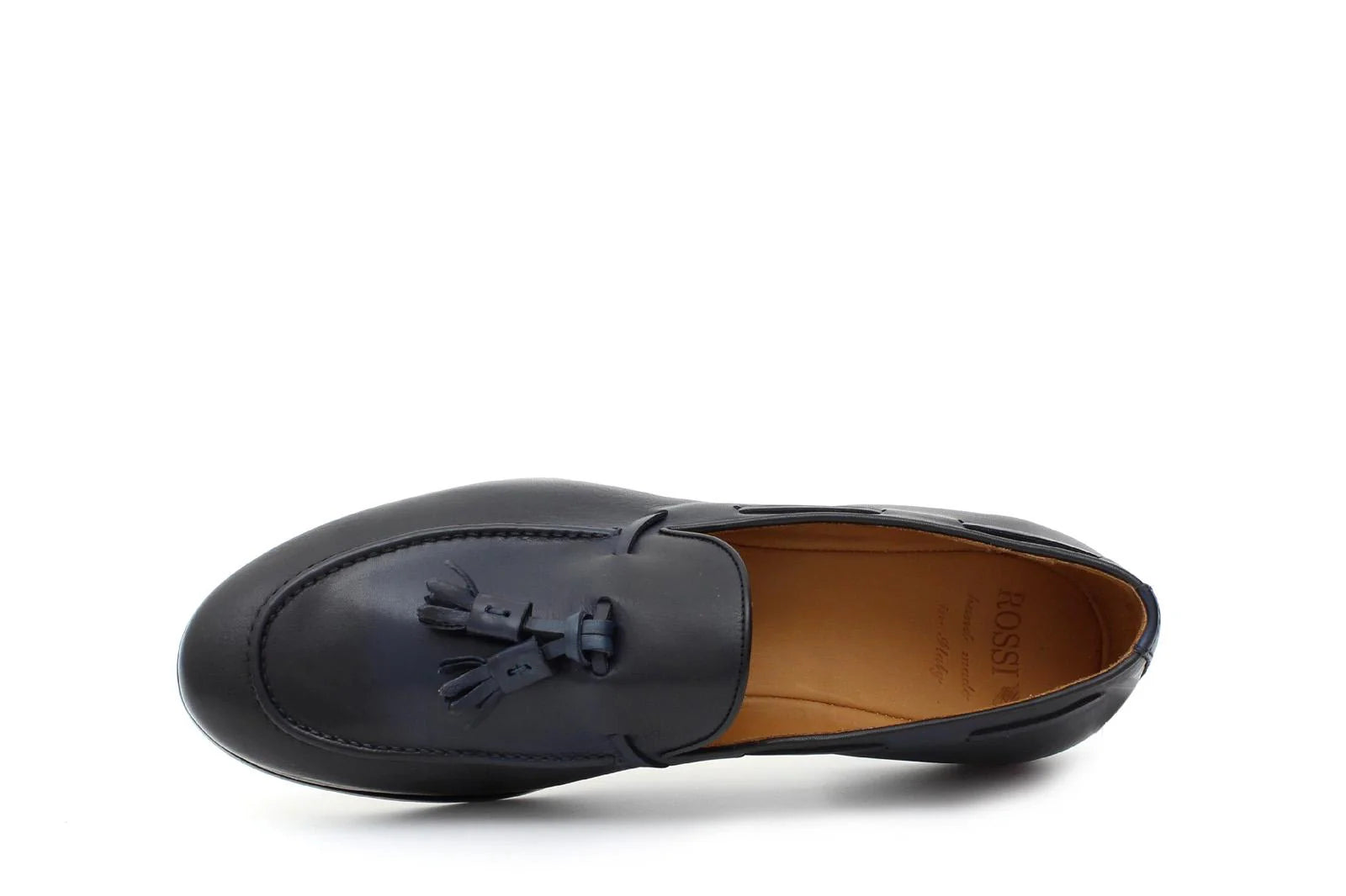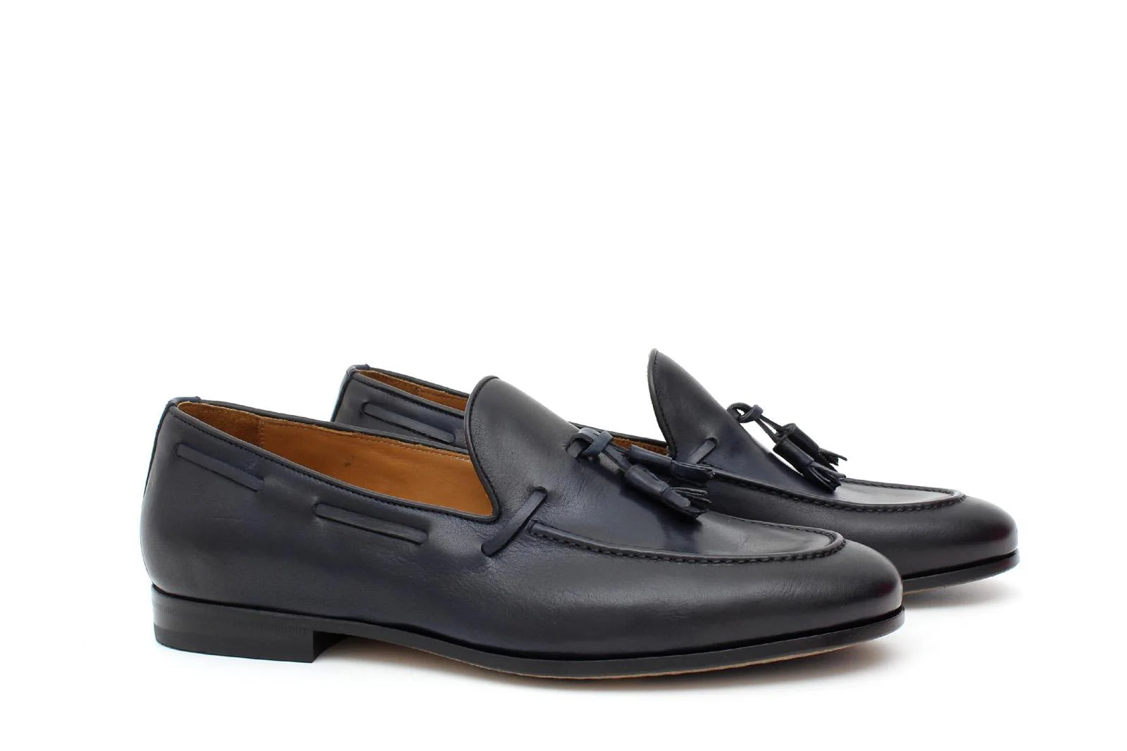 • Mocassino a sacchetto intero in vitello naturale color blu sfumato