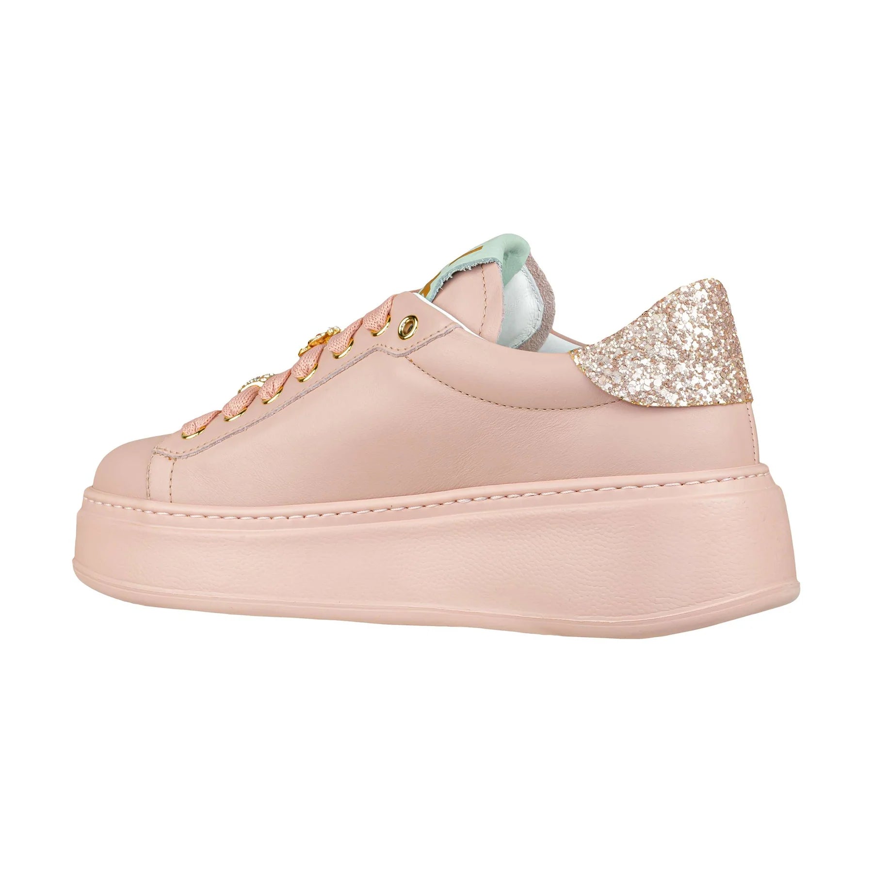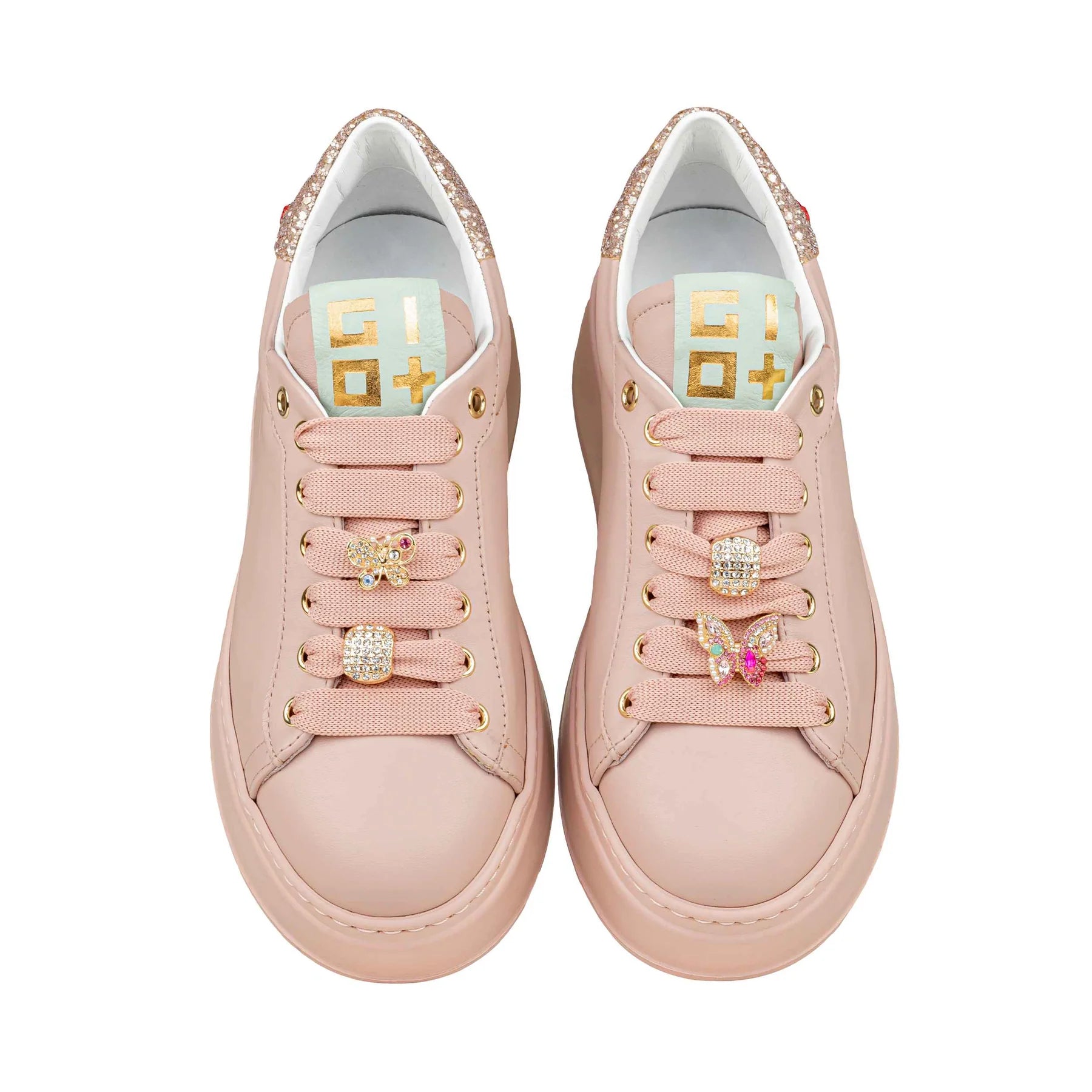 • Sneakers low top di GIO+ in pelle rosa con talloncino in glitter.