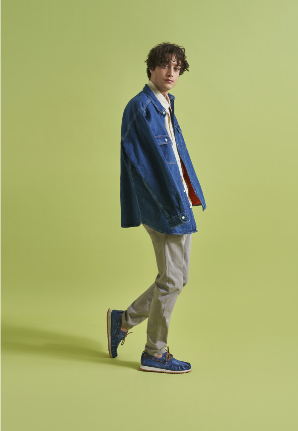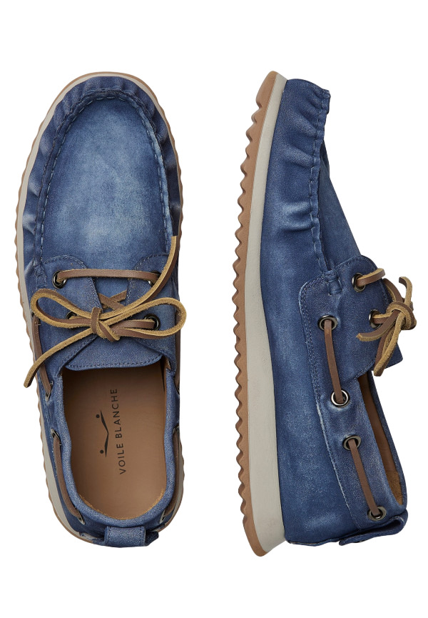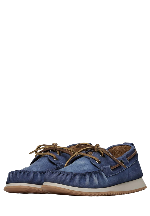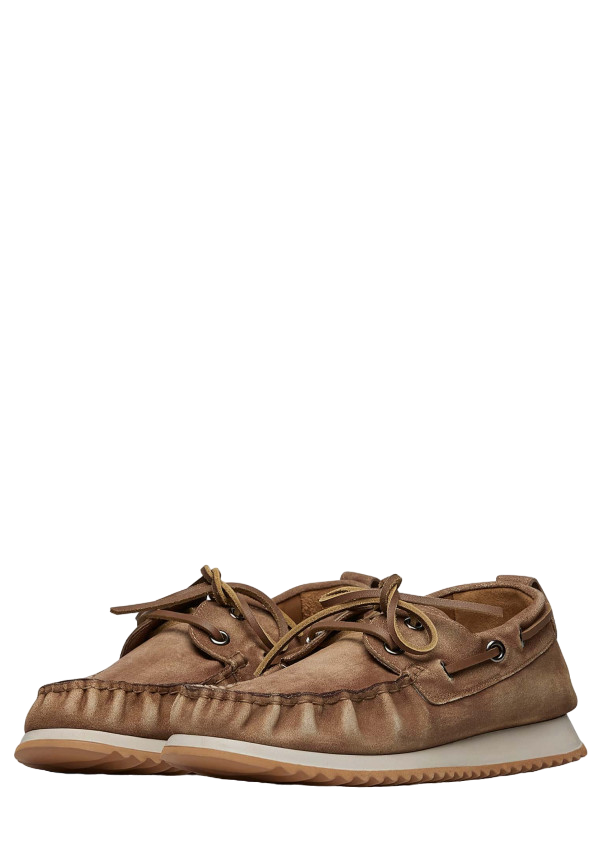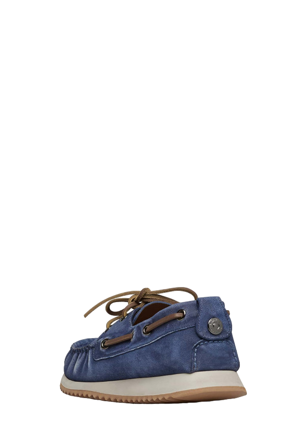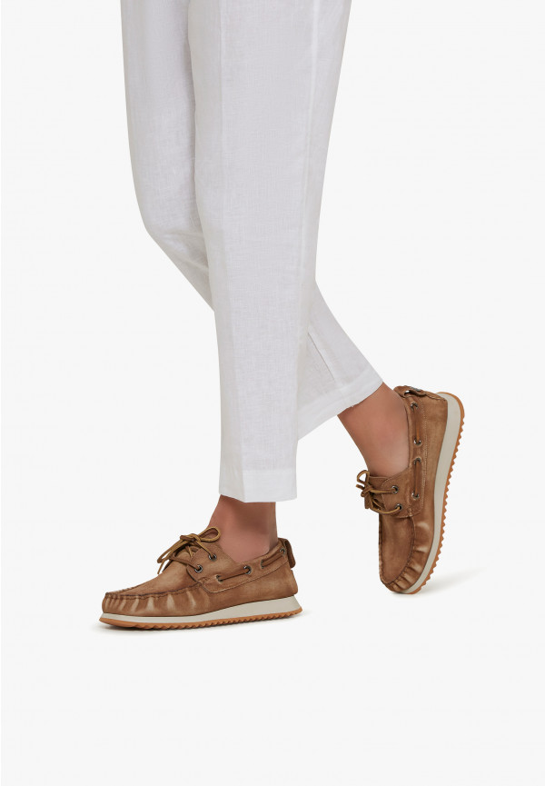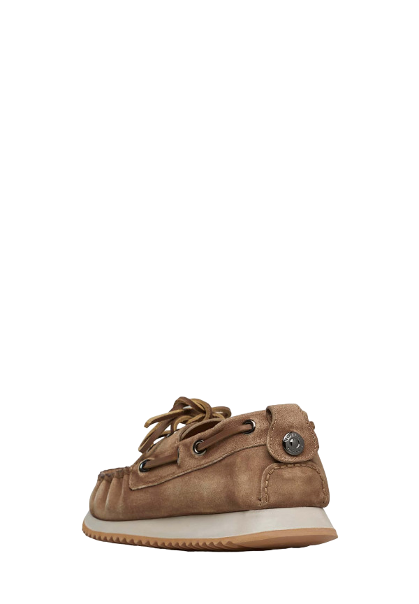 - Mocassino a barca in suede délavé, con bottone personalizzato sul retro.