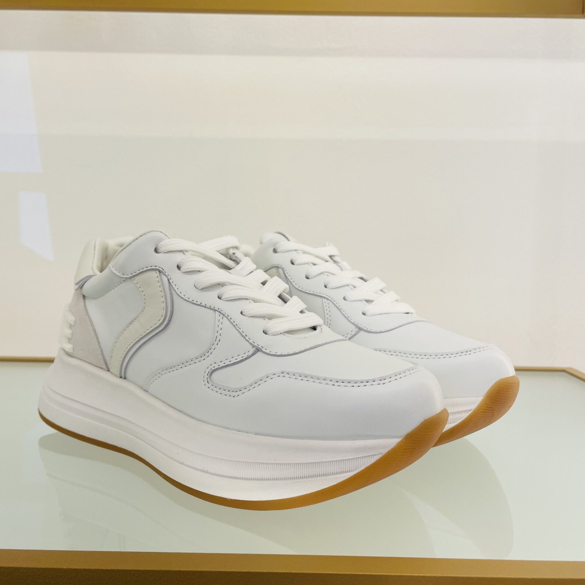 - Sneaker in vitello, con soletta interna estraibile, logo sul topponcino e suola a doppia altezza in gomma ultra leggera.